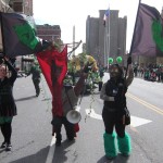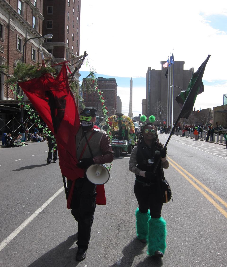 The Baroness was at the wheel once we entered the parade. War Zone entertained the crowd with megaphone chants about Töad Meädow, art, beer and bacon. Julie and Jay carried Töad flags, and the Töad King even managed to get a picture on the semi-famous St. Patrick’s Day couch.
